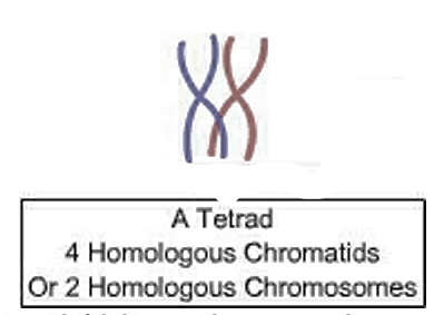 b) Bivalent or tetrad is the pair of complexes formed by a pair of synapsed homologous chromosomes during the zygotene of prophase I of meiosis.